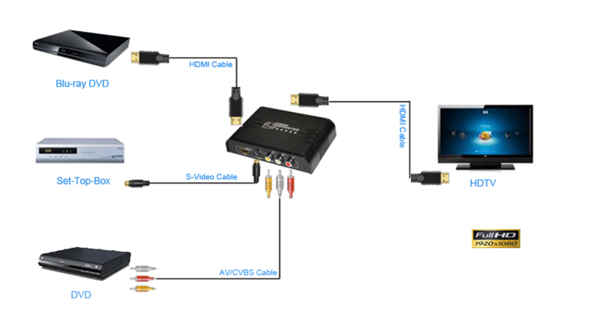 - แปลงสัญญาณวีดีโอจาก AV Composite เป็นสัญญาณ HDMI (AV to HDMI Converter) ที่ความละเอียดสูงจากสัญญาณต้นทาง หรืออัพสเกลสัญญาณ HDMI เป็น สัญญาณ HDMI ที่มีความละเอียดมากสุดถึง 1080P เหมาะสำหรับ เครื่องเล่น DVD, เกมคอนโซล หรือ อุปกรณ์ที่เป็นสัญญาณ อะนาล็อกรุ่นเก่าๆ ที่ต้องการเปลี่ยนเป็นสัญญาณในระบบ HD